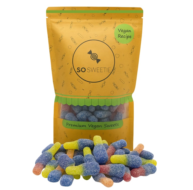 A plant-based twist on the cola bottle classic. Fizzy, tangy, and coated in sugar for a nostalgic sweet experience.